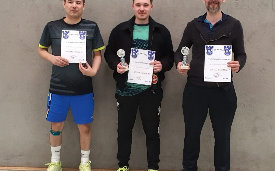 Die diesjährige Weihnachtsfeier der Erwachsenen fand am gestrigen Freitagabend in unserer Halle statt und war erfreulich gut besucht. Nach leckerer Pizza und Weihnachtsgebäck folgte ein Doppelturnier, das von Rainer Schmitt organisiert wurde, so dass die zugenommenen Kalorien gleich wieder verbrannt werden konnten. Bei dem Turnier wurden die Paarungen über Spielkarten einander zugeordnet und es wurden immer zwei kurze Sätze gespielt. So kam es stets zu neuen interessanten Paarungen, die allen 20 Teilnehmern viel Spaß bereiteten. Am Ende setzte sich Joshua Anwander knapp vor Julian Hildebrandt und Thomas Müller durch und alle Teilnehmer wurden von Rainer in einer kleinen Siegerehrung mit einer Urkunde belohnt..